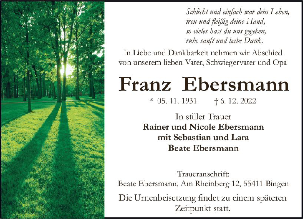 Hier finden Sie alle Traueranzeigen aus der Zeitung, die bisher für Franz Ebersmann erschienen sind. Weitere Traueranzeigen, die in der Zeitung erscheinen, werden hier ebenfalls aufgelistet