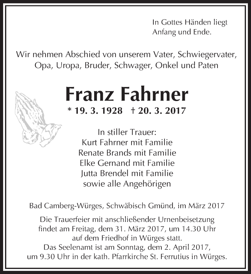 Hier finden Sie alle Traueranzeigen aus der Zeitung, die bisher für Franz Fahrner erschienen sind. Weitere Traueranzeigen, die in der Zeitung erscheinen, werden hier ebenfalls aufgelistet