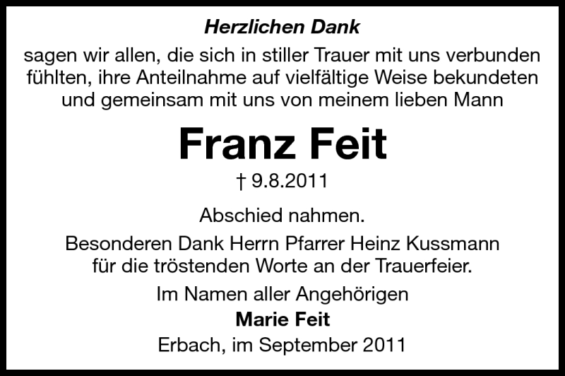 Hier finden Sie alle Traueranzeigen aus der Zeitung, die bisher für Franz Feit erschienen sind. Weitere Traueranzeigen, die in der Zeitung erscheinen, werden hier ebenfalls aufgelistet