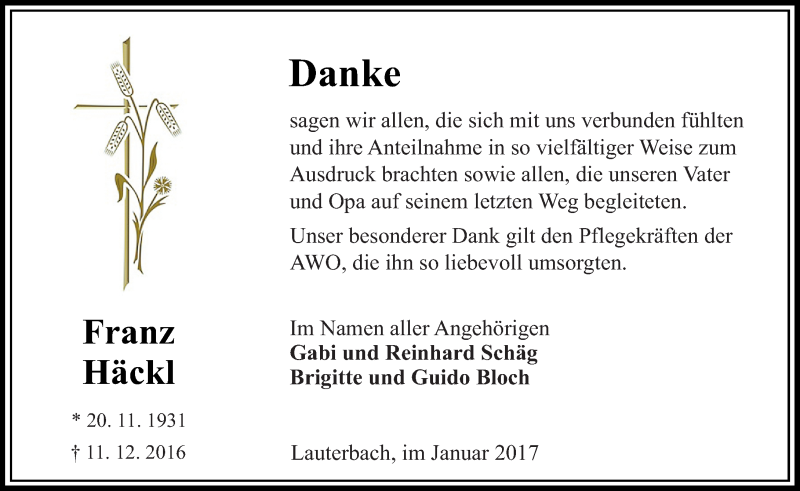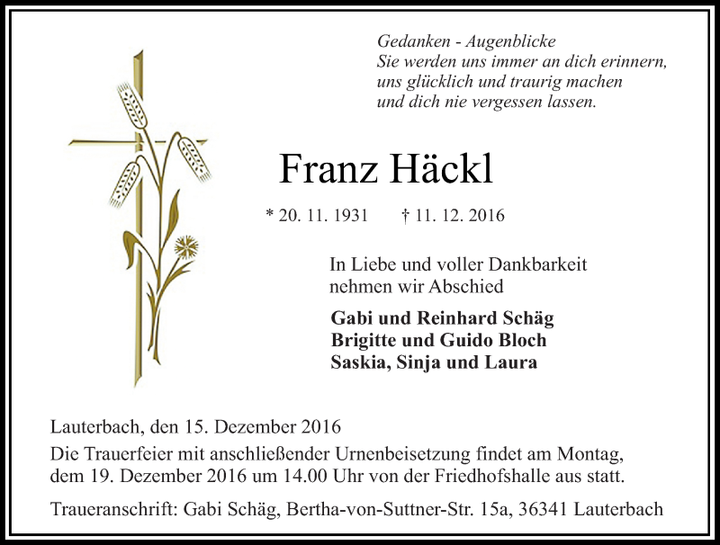 Hier finden Sie alle Traueranzeigen aus der Zeitung, die bisher für Franz Häckl erschienen sind. Weitere Traueranzeigen, die in der Zeitung erscheinen, werden hier ebenfalls aufgelistet