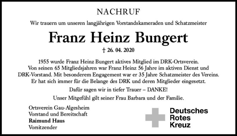 Hier finden Sie alle Traueranzeigen aus der Zeitung, die bisher für Franz Heinz Bungert erschienen sind. Weitere Traueranzeigen, die in der Zeitung erscheinen, werden hier ebenfalls aufgelistet