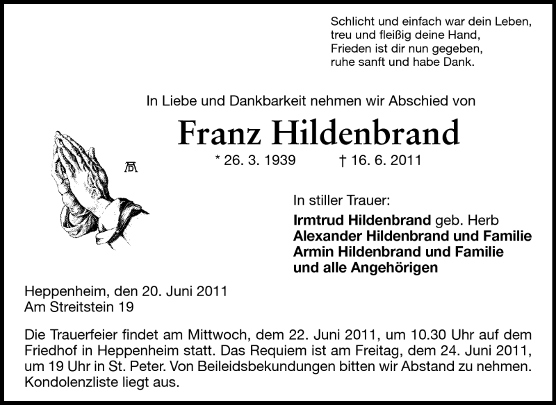 Hier finden Sie alle Traueranzeigen aus der Zeitung, die bisher für Franz Hildenbrand erschienen sind. Weitere Traueranzeigen, die in der Zeitung erscheinen, werden hier ebenfalls aufgelistet