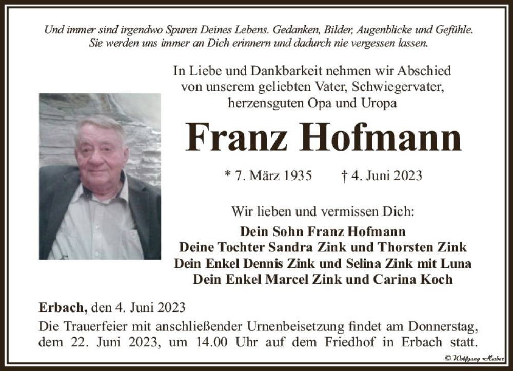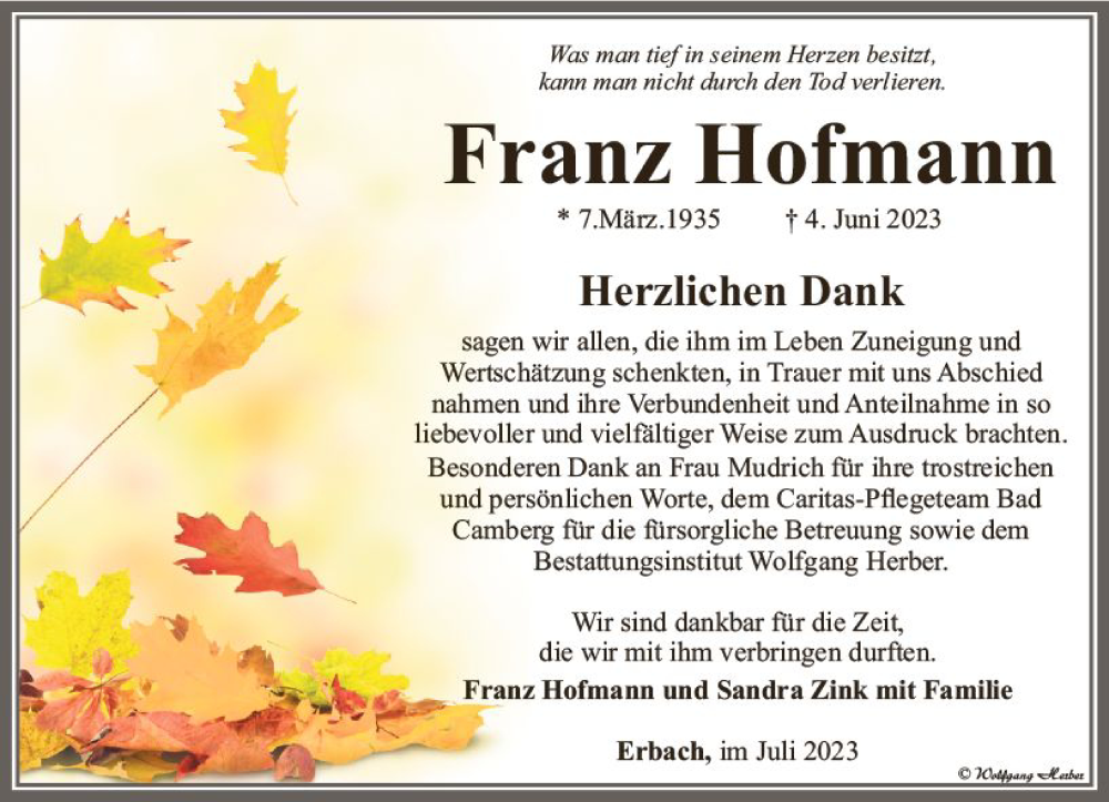 Hier finden Sie alle Traueranzeigen aus der Zeitung, die bisher für Franz Hofmann erschienen sind. Weitere Traueranzeigen, die in der Zeitung erscheinen, werden hier ebenfalls aufgelistet