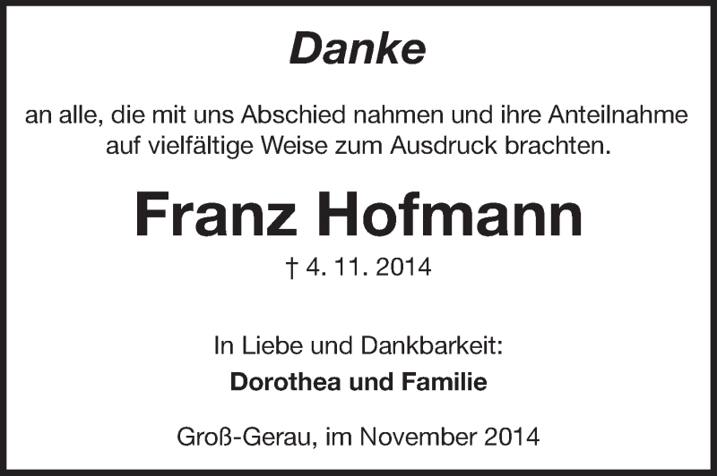Hier finden Sie alle Traueranzeigen aus der Zeitung, die bisher für Franz Hofmann erschienen sind. Weitere Traueranzeigen, die in der Zeitung erscheinen, werden hier ebenfalls aufgelistet