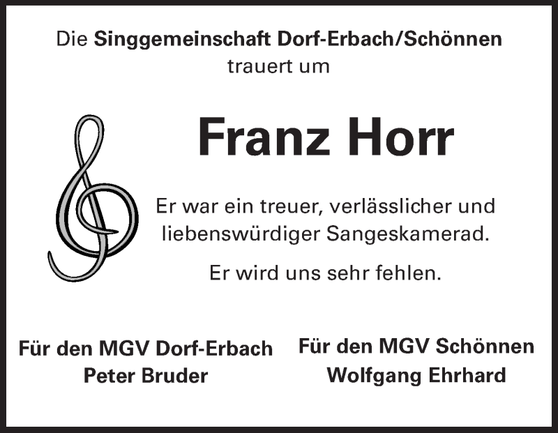 Hier finden Sie alle Traueranzeigen aus der Zeitung, die bisher für Franz Horr erschienen sind. Weitere Traueranzeigen, die in der Zeitung erscheinen, werden hier ebenfalls aufgelistet