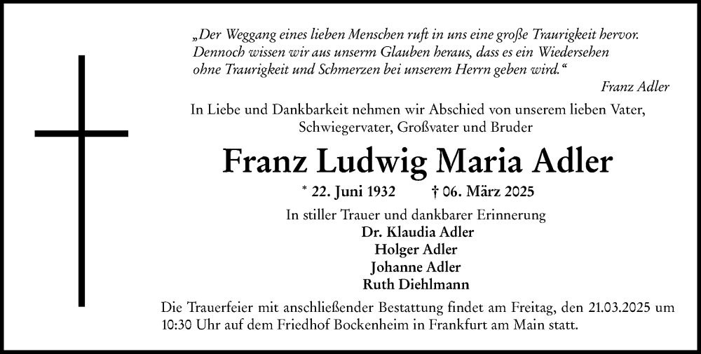 Hier finden Sie alle Traueranzeigen aus der Zeitung, die bisher für Franz Ludwig Maria Adler erschienen sind. Weitere Traueranzeigen, die in der Zeitung erscheinen, werden hier ebenfalls aufgelistet