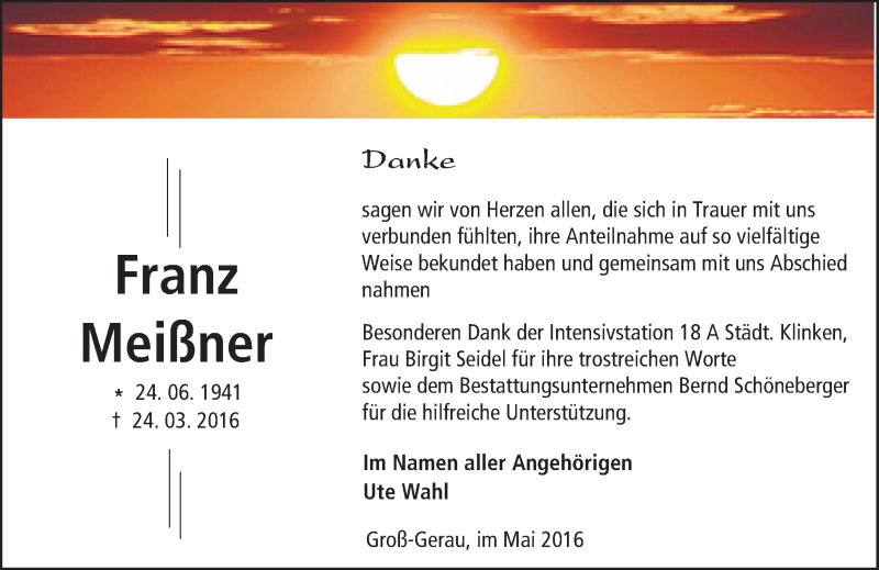Hier finden Sie alle Traueranzeigen aus der Zeitung, die bisher für Franz Meißner erschienen sind. Weitere Traueranzeigen, die in der Zeitung erscheinen, werden hier ebenfalls aufgelistet