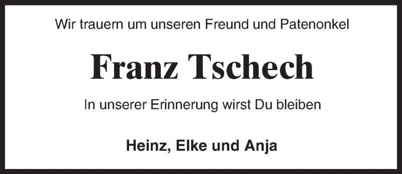 Hier finden Sie alle Traueranzeigen aus der Zeitung, die bisher für Franz Tschech erschienen sind. Weitere Traueranzeigen, die in der Zeitung erscheinen, werden hier ebenfalls aufgelistet