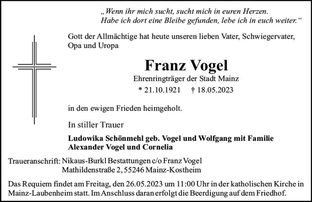 Hier finden Sie alle Traueranzeigen aus der Zeitung, die bisher für Franz Vogel erschienen sind. Weitere Traueranzeigen, die in der Zeitung erscheinen, werden hier ebenfalls aufgelistet