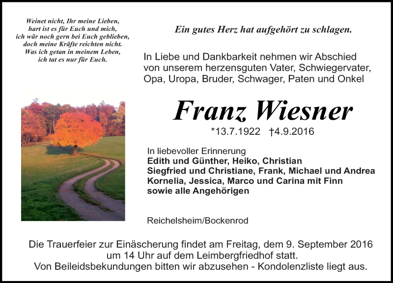 Hier finden Sie alle Traueranzeigen aus der Zeitung, die bisher für Franz Wiesener erschienen sind. Weitere Traueranzeigen, die in der Zeitung erscheinen, werden hier ebenfalls aufgelistet