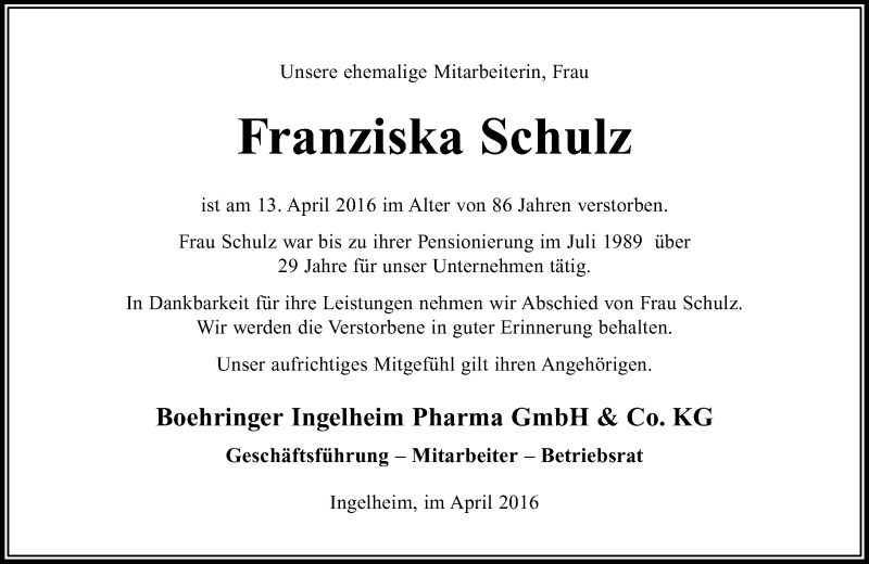 Hier finden Sie alle Traueranzeigen aus der Zeitung, die bisher für Franziska Schulz erschienen sind. Weitere Traueranzeigen, die in der Zeitung erscheinen, werden hier ebenfalls aufgelistet