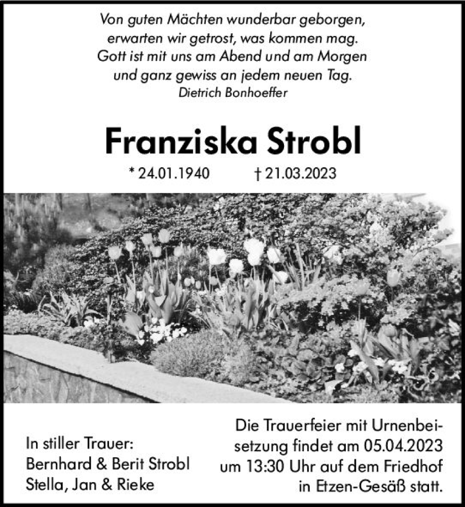 Hier finden Sie alle Traueranzeigen aus der Zeitung, die bisher für Franziska Strobl erschienen sind. Weitere Traueranzeigen, die in der Zeitung erscheinen, werden hier ebenfalls aufgelistet