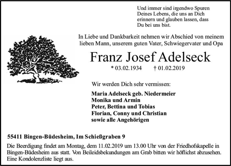 Hier finden Sie alle Traueranzeigen aus der Zeitung, die bisher für Franz Josef Adelseck erschienen sind. Weitere Traueranzeigen, die in der Zeitung erscheinen, werden hier ebenfalls aufgelistet