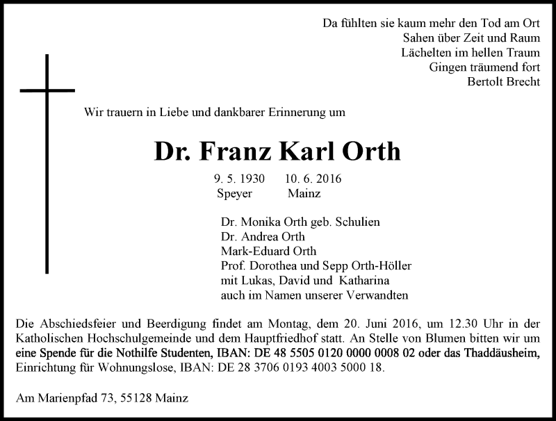 Hier finden Sie alle Traueranzeigen aus der Zeitung, die bisher für Franz Karl Orth erschienen sind. Weitere Traueranzeigen, die in der Zeitung erscheinen, werden hier ebenfalls aufgelistet