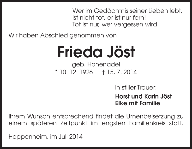Hier finden Sie alle Traueranzeigen aus der Zeitung, die bisher für Frieda Jöst erschienen sind. Weitere Traueranzeigen, die in der Zeitung erscheinen, werden hier ebenfalls aufgelistet