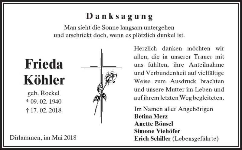 Hier finden Sie alle Traueranzeigen aus der Zeitung, die bisher für Frieda Köhler erschienen sind. Weitere Traueranzeigen, die in der Zeitung erscheinen, werden hier ebenfalls aufgelistet