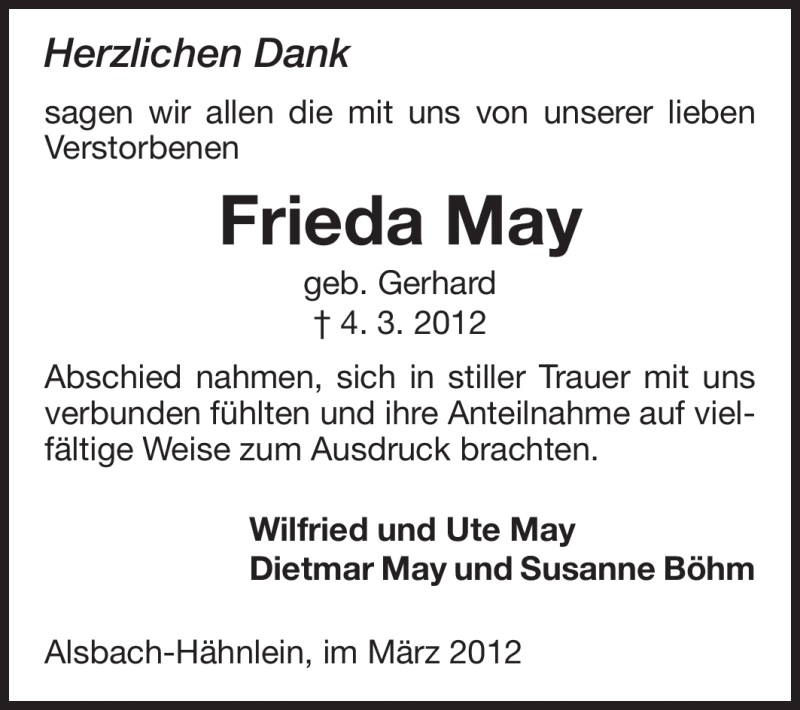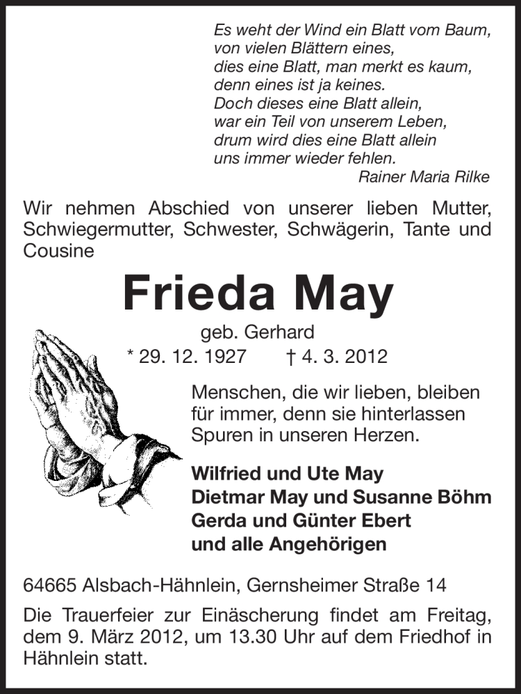 Hier finden Sie alle Traueranzeigen aus der Zeitung, die bisher für Frieda May erschienen sind. Weitere Traueranzeigen, die in der Zeitung erscheinen, werden hier ebenfalls aufgelistet