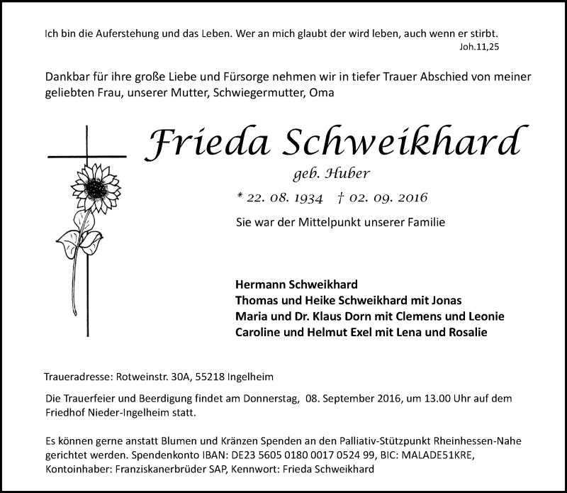 Hier finden Sie alle Traueranzeigen aus der Zeitung, die bisher für Frieda Schweikhard erschienen sind. Weitere Traueranzeigen, die in der Zeitung erscheinen, werden hier ebenfalls aufgelistet