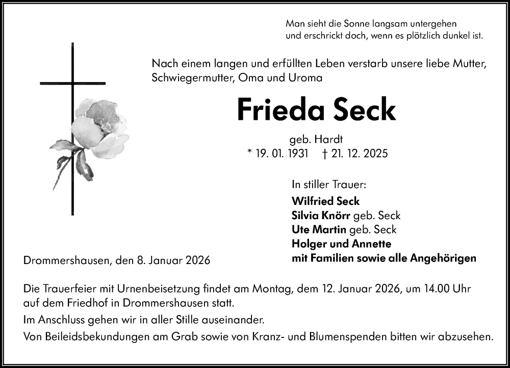 Hier finden Sie alle Traueranzeigen aus der Zeitung, die bisher für Frieda Seck erschienen sind. Weitere Traueranzeigen, die in der Zeitung erscheinen, werden hier ebenfalls aufgelistet