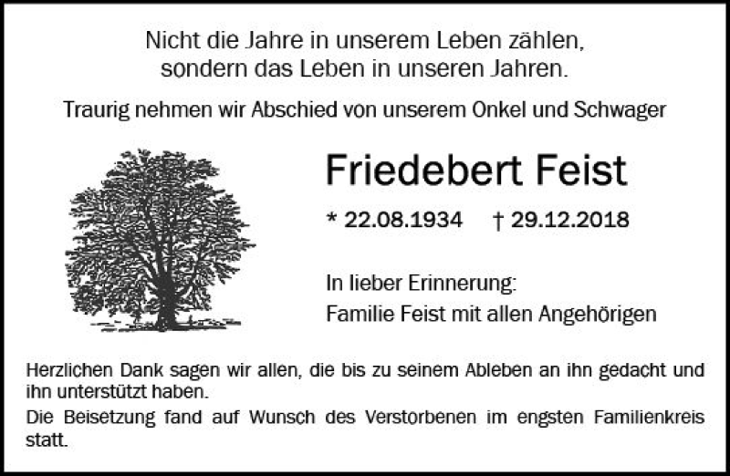 Hier finden Sie alle Traueranzeigen aus der Zeitung, die bisher für Friedebert Feist erschienen sind. Weitere Traueranzeigen, die in der Zeitung erscheinen, werden hier ebenfalls aufgelistet