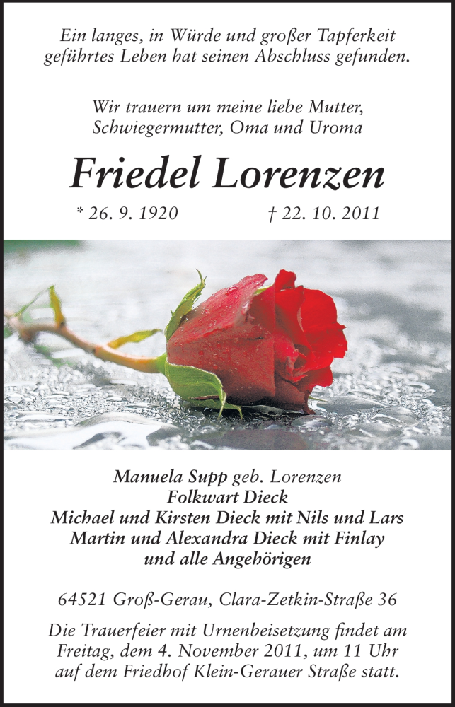 Hier finden Sie alle Traueranzeigen aus der Zeitung, die bisher für Friedel Lorenzen erschienen sind. Weitere Traueranzeigen, die in der Zeitung erscheinen, werden hier ebenfalls aufgelistet