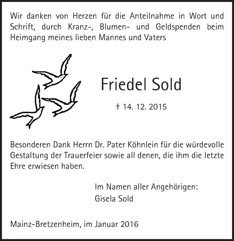 Hier finden Sie alle Traueranzeigen aus der Zeitung, die bisher für Friedel Sold erschienen sind. Weitere Traueranzeigen, die in der Zeitung erscheinen, werden hier ebenfalls aufgelistet