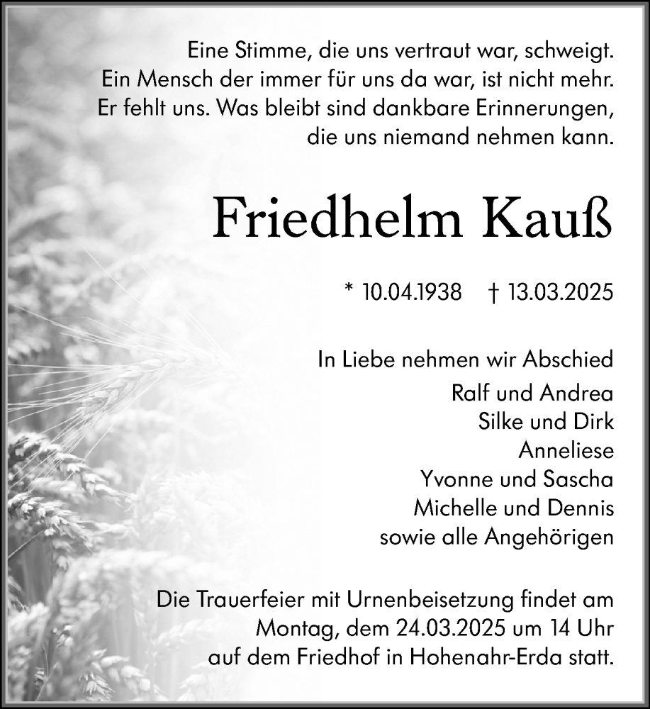Hier finden Sie alle Traueranzeigen aus der Zeitung, die bisher für Friedhelm Kauß erschienen sind. Weitere Traueranzeigen, die in der Zeitung erscheinen, werden hier ebenfalls aufgelistet