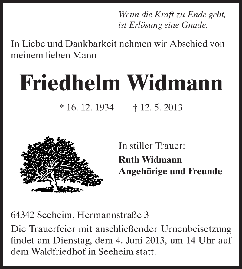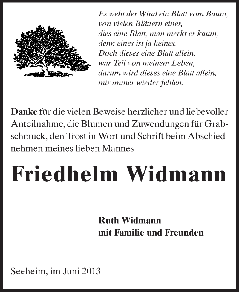 Hier finden Sie alle Traueranzeigen aus der Zeitung, die bisher für Friedhelm Widmann erschienen sind. Weitere Traueranzeigen, die in der Zeitung erscheinen, werden hier ebenfalls aufgelistet