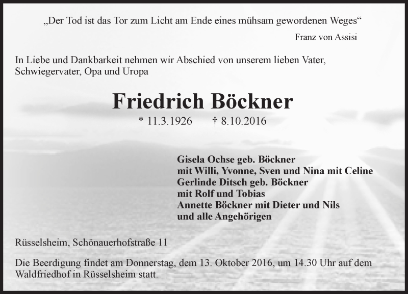 Hier finden Sie alle Traueranzeigen aus der Zeitung, die bisher für Friedrich Böckner erschienen sind. Weitere Traueranzeigen, die in der Zeitung erscheinen, werden hier ebenfalls aufgelistet