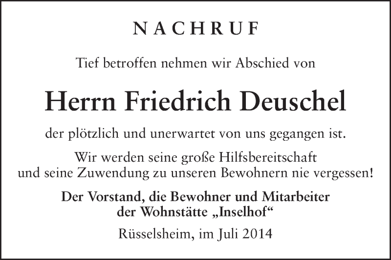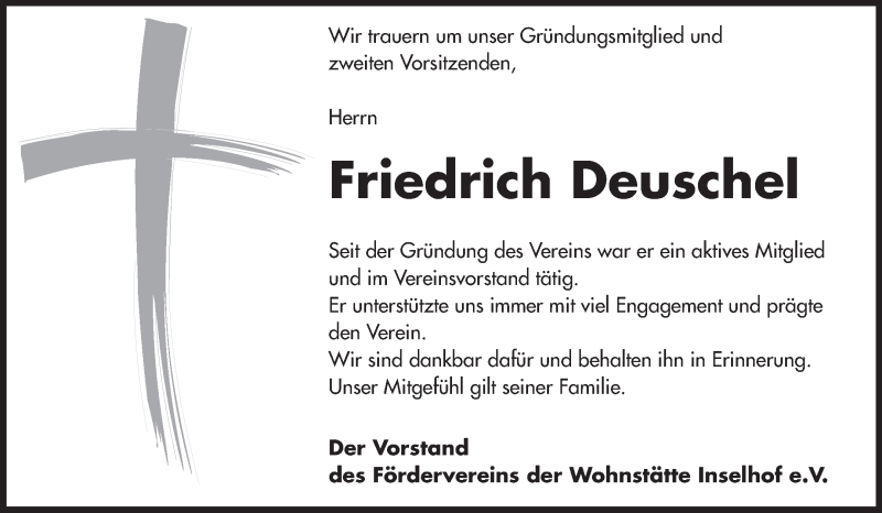 Hier finden Sie alle Traueranzeigen aus der Zeitung, die bisher für Friedrich Deuschel erschienen sind. Weitere Traueranzeigen, die in der Zeitung erscheinen, werden hier ebenfalls aufgelistet