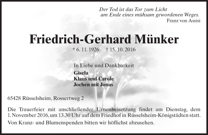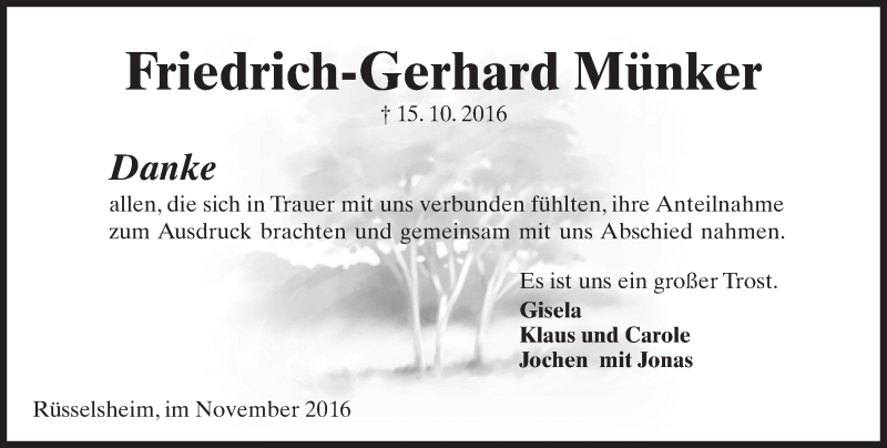 Hier finden Sie alle Traueranzeigen aus der Zeitung, die bisher für Friedrich-Gerhard Münker erschienen sind. Weitere Traueranzeigen, die in der Zeitung erscheinen, werden hier ebenfalls aufgelistet