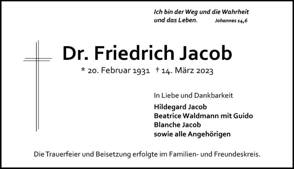 Hier finden Sie alle Traueranzeigen aus der Zeitung, die bisher für Friedrich Jacob erschienen sind. Weitere Traueranzeigen, die in der Zeitung erscheinen, werden hier ebenfalls aufgelistet