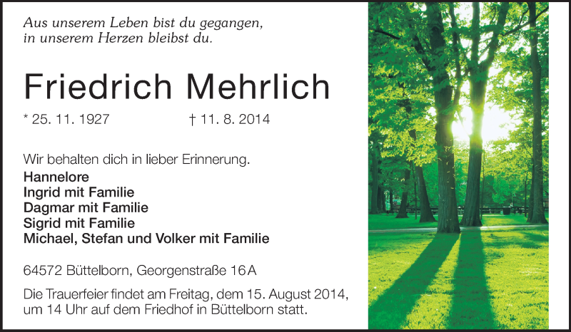 Hier finden Sie alle Traueranzeigen aus der Zeitung, die bisher für Friedrich Mehrlich erschienen sind. Weitere Traueranzeigen, die in der Zeitung erscheinen, werden hier ebenfalls aufgelistet