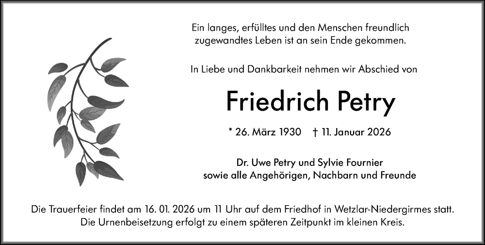 Hier finden Sie alle Traueranzeigen aus der Zeitung, die bisher für Friedrich Petry erschienen sind. Weitere Traueranzeigen, die in der Zeitung erscheinen, werden hier ebenfalls aufgelistet