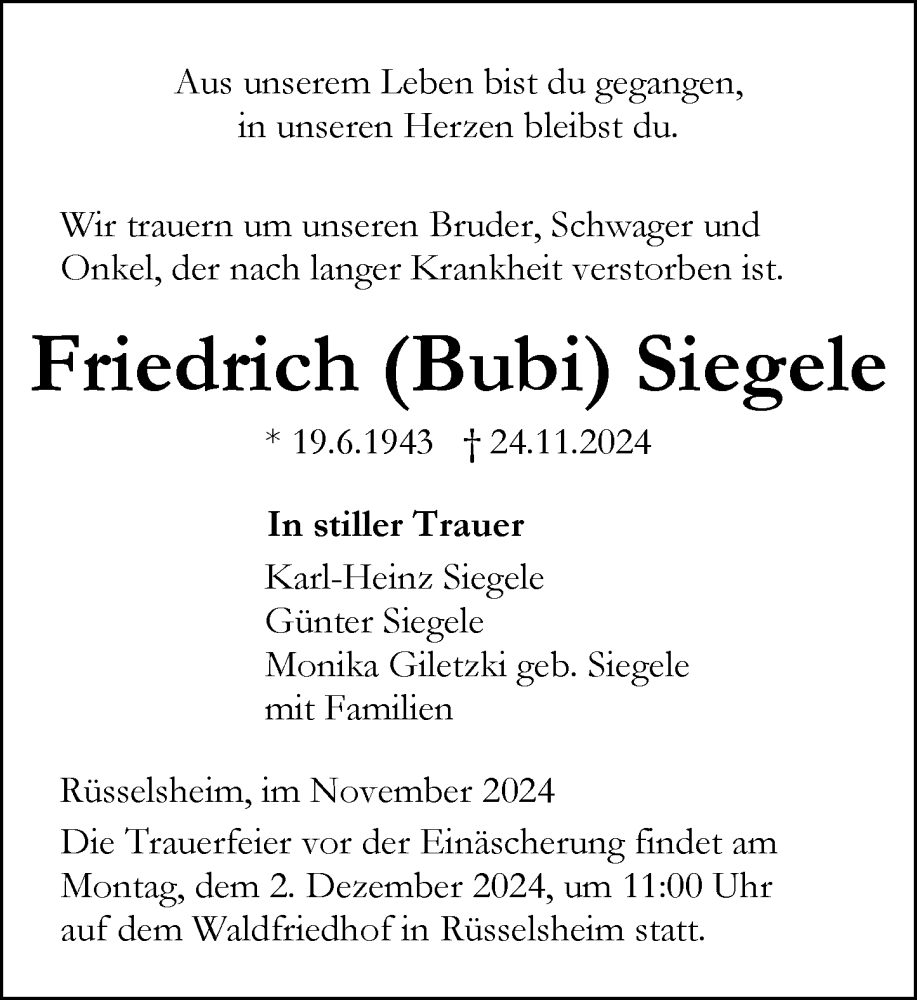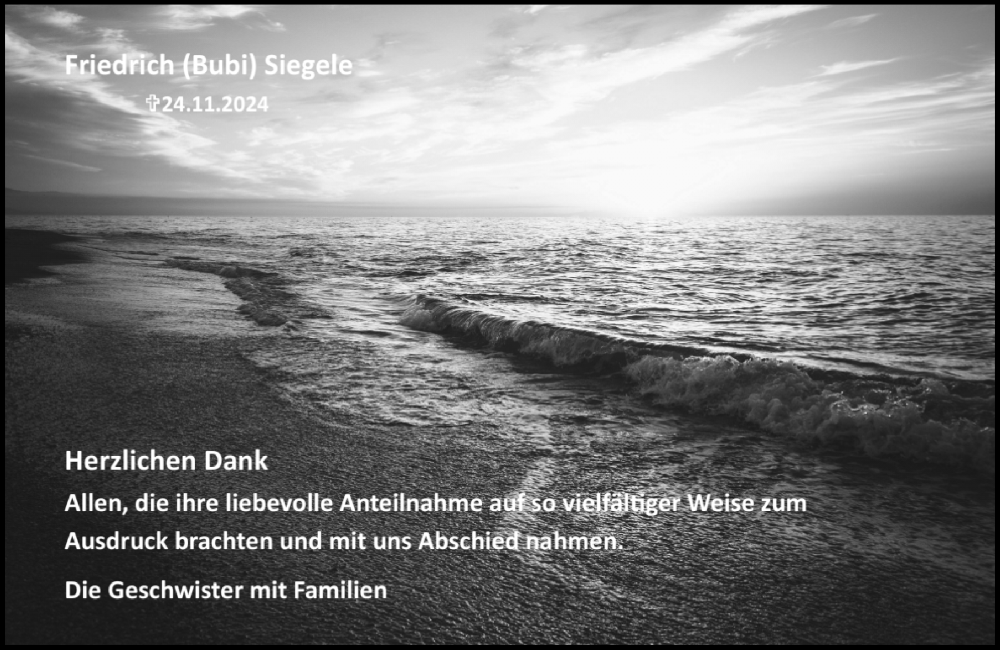 Hier finden Sie alle Traueranzeigen aus der Zeitung, die bisher für Friedrich Siegele erschienen sind. Weitere Traueranzeigen, die in der Zeitung erscheinen, werden hier ebenfalls aufgelistet