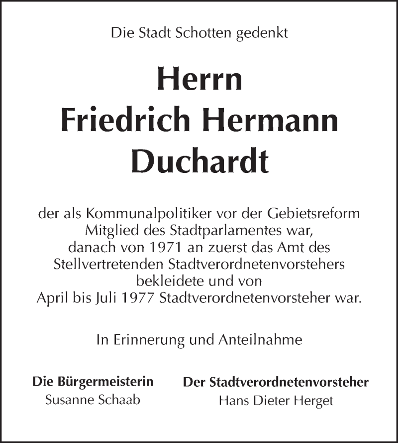 Hier finden Sie alle Traueranzeigen aus der Zeitung, die bisher für Friedrich Hermann Duchardt erschienen sind. Weitere Traueranzeigen, die in der Zeitung erscheinen, werden hier ebenfalls aufgelistet