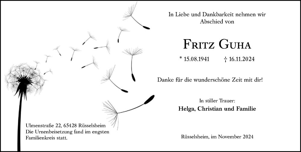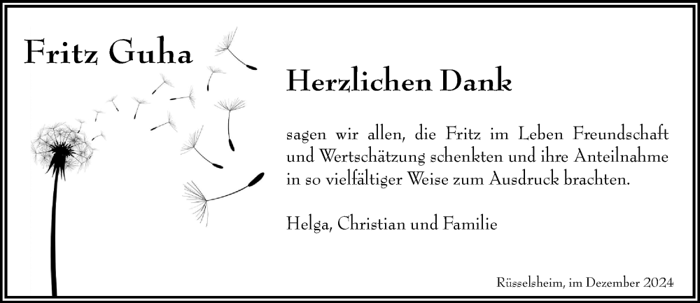 Hier finden Sie alle Traueranzeigen aus der Zeitung, die bisher für Fritz Guha erschienen sind. Weitere Traueranzeigen, die in der Zeitung erscheinen, werden hier ebenfalls aufgelistet