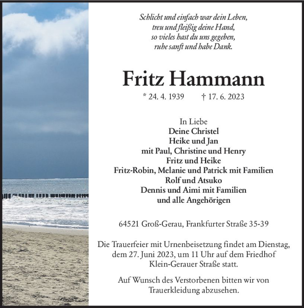 Hier finden Sie alle Traueranzeigen aus der Zeitung, die bisher für Fritz Hammann erschienen sind. Weitere Traueranzeigen, die in der Zeitung erscheinen, werden hier ebenfalls aufgelistet