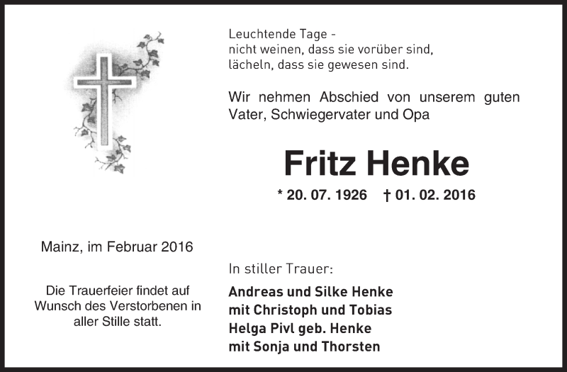 Hier finden Sie alle Traueranzeigen aus der Zeitung, die bisher für Fritz Henke erschienen sind. Weitere Traueranzeigen, die in der Zeitung erscheinen, werden hier ebenfalls aufgelistet