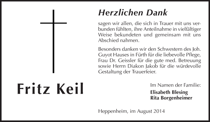 Hier finden Sie alle Traueranzeigen aus der Zeitung, die bisher für Fritz Keil erschienen sind. Weitere Traueranzeigen, die in der Zeitung erscheinen, werden hier ebenfalls aufgelistet