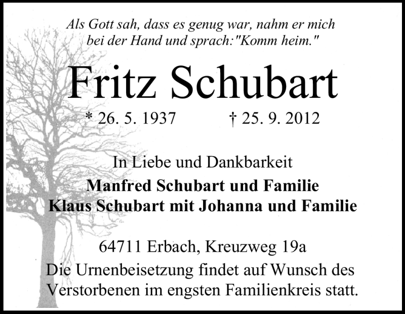 Hier finden Sie alle Traueranzeigen aus der Zeitung, die bisher für Fritz Schubart erschienen sind. Weitere Traueranzeigen, die in der Zeitung erscheinen, werden hier ebenfalls aufgelistet
