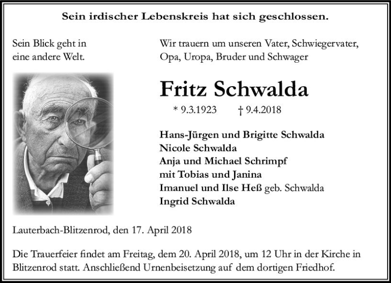 Hier finden Sie alle Traueranzeigen aus der Zeitung, die bisher für Fritz Schwalda erschienen sind. Weitere Traueranzeigen, die in der Zeitung erscheinen, werden hier ebenfalls aufgelistet