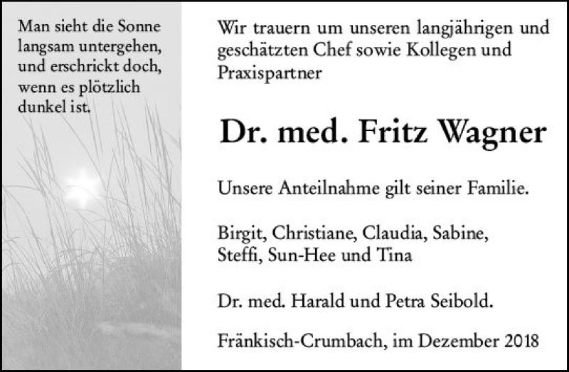 Hier finden Sie alle Traueranzeigen aus der Zeitung, die bisher für Fritz Wagner erschienen sind. Weitere Traueranzeigen, die in der Zeitung erscheinen, werden hier ebenfalls aufgelistet