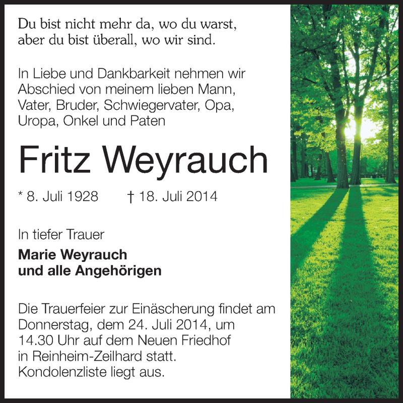 Hier finden Sie alle Traueranzeigen aus der Zeitung, die bisher für Fritz Weyrauch erschienen sind. Weitere Traueranzeigen, die in der Zeitung erscheinen, werden hier ebenfalls aufgelistet