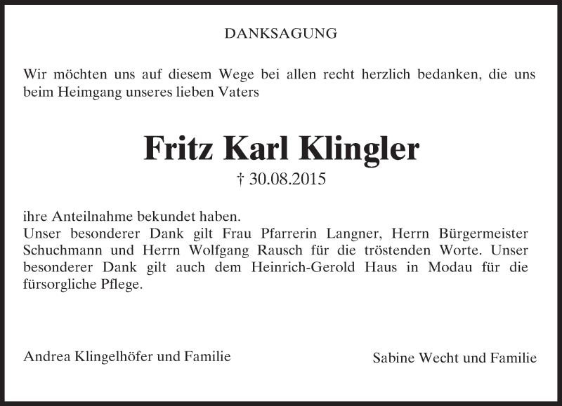 Hier finden Sie alle Traueranzeigen aus der Zeitung, die bisher für Fritz Karl Klingler erschienen sind. Weitere Traueranzeigen, die in der Zeitung erscheinen, werden hier ebenfalls aufgelistet