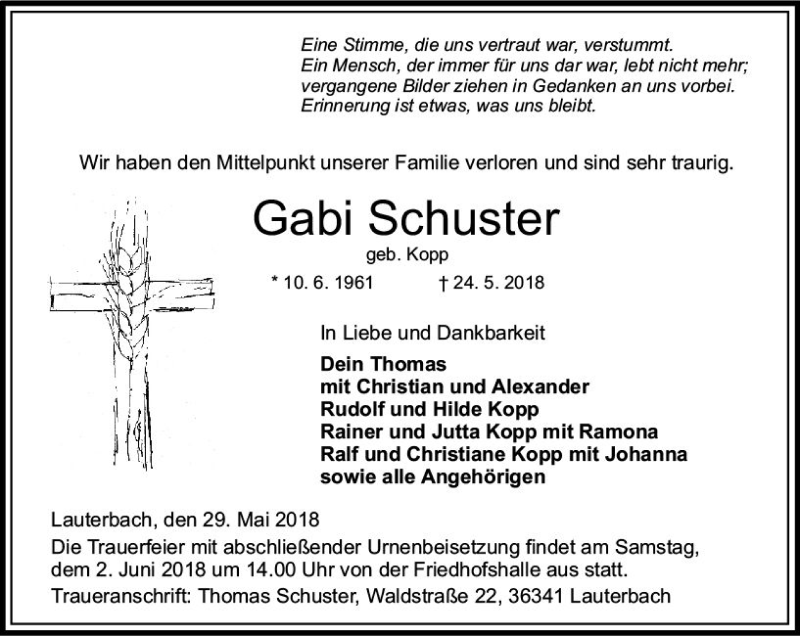 Hier finden Sie alle Traueranzeigen aus der Zeitung, die bisher für Gabi Schuster erschienen sind. Weitere Traueranzeigen, die in der Zeitung erscheinen, werden hier ebenfalls aufgelistet