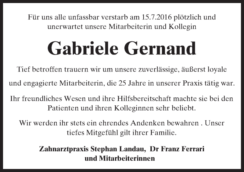 Hier finden Sie alle Traueranzeigen aus der Zeitung, die bisher für Gabriele Gernand erschienen sind. Weitere Traueranzeigen, die in der Zeitung erscheinen, werden hier ebenfalls aufgelistet