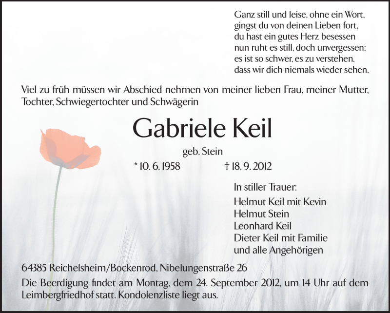 Hier finden Sie alle Traueranzeigen aus der Zeitung, die bisher für Gabriele Keil erschienen sind. Weitere Traueranzeigen, die in der Zeitung erscheinen, werden hier ebenfalls aufgelistet