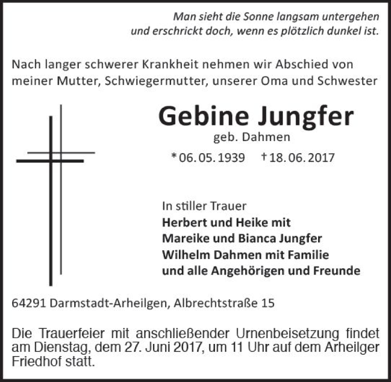 Hier finden Sie alle Traueranzeigen aus der Zeitung, die bisher für Gebine Jungfer erschienen sind. Weitere Traueranzeigen, die in der Zeitung erscheinen, werden hier ebenfalls aufgelistet