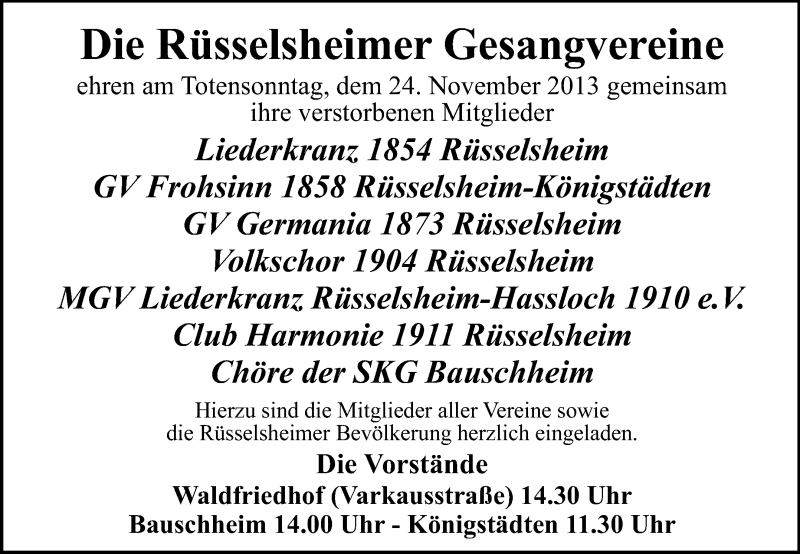 Hier finden Sie alle Traueranzeigen aus der Zeitung, die bisher für Gedenken Rüsselsheimer Gesangvereine erschienen sind. Weitere Traueranzeigen, die in der Zeitung erscheinen, werden hier ebenfalls aufgelistet